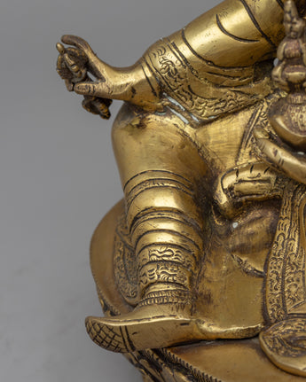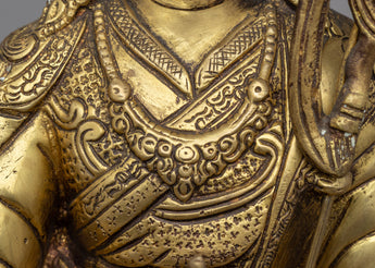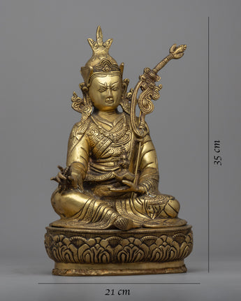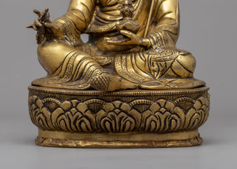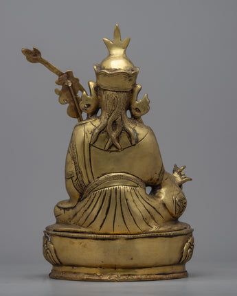 Padmasambhava Statue is a lovely handcrafted brass sculpture of a deity sitting in a serene meditative pose on a lotus base. The statue is meticulously crafted, with attention paid to even the slightest details. Padmasambhava is holding a vajra, a sign of spiritual power, and a skull cup filled with nectar, representing the wisdom that comes with enlightenment. On the left shoulder is also a trident, which represents the ability to overcome obstacles on the spiritual path. The statue exudes serenity and tranquillity, making it ideal for any meditation place or shrine.