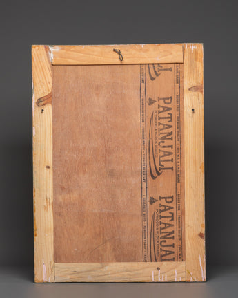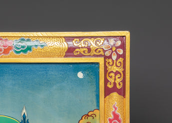 This wall hanging is expertly made from wood and painted with acrylic colors, giving it a bright energy and precise detail. Padmasambhava is shown seated on a lotus throne, holding his vajra and skull cup, which represent his control of the spiritual and material domains. The halo, lotus blooms, and traditional Tibetan patterns that surround him emphasize the artistry and devotion that went into the sculpture. The ornate gold frame adds a sense of extra, enhancing both spiritual and visual appeal.