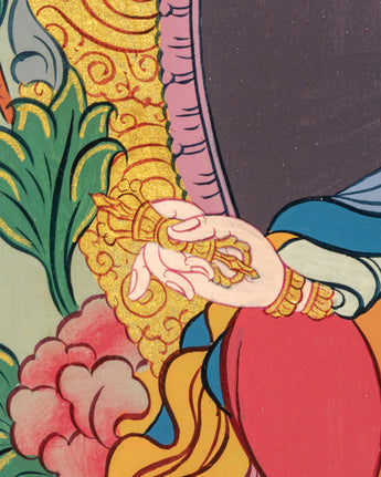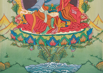 This Padmasambhava Wall Hanging is a sacred portrayal of Guru Rinpoche, the famous master who introduced Buddhism into Tibet. This hand-painted wall art, 81cm tall and 58.5cm wide, represents the gifts of wisdom, compassion, and protection. Padmasambhava, also known as the Lotus-Born, is revered as a second Buddha in Tibetan tradition, making this artwork an effective spiritual presence in meditation rooms, temples, or spiritual areas.