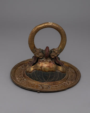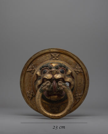 This exquisite pair of Buddhist lion-head door Knockers is expertly crafted on a copper body and lavishly plated in opulent gold. The elaborate repoussé work, a classic metalworking technique, gives the lion-head design more depth and richness. These knockers with lion heads, a Buddhist symbol for power, strength, and protection, are helpful and make a striking design statement for your house.