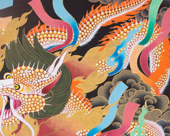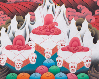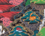 Palden Lhamo is one of the main Dharma Protectors in Tibetan Buddhism. Also known as Shri Devi in Sanskrit, she is a direct emanation of the Goddess Saraswati, manifesting in a wrathful form. Above her is Lama Tsongkhapa, the renowned 14th-century Tibetan saint, and scholar. To Lama Tsongkhapa's right is his heart disciple, Gyaltsab Rinpoche, and to his left is his other heart disciple, Khedrub Rinpoche.