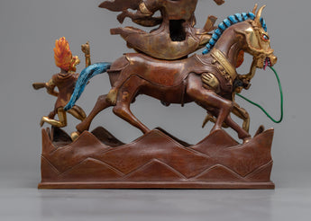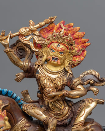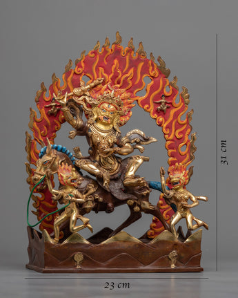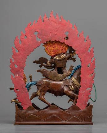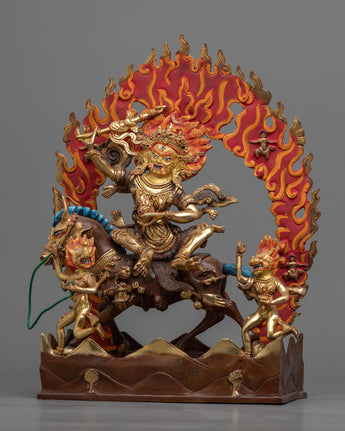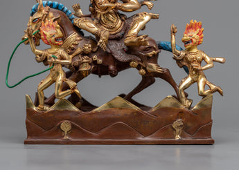 This exquisite piece of Palden Lhamo Empowerment sculpture employs traditional Himalayan motifs and designs delicately produced in our studio. The deity is depicted riding a mule with a wrathful appearance amongst blazing flames that represent her ability to navigate difficult terrain and her role as a protector of the Dharma. She can be seen carrying a trident in her right hand, representing her power to overcome obstacles, and a skull cup in her right hand, a symbol of life's impermanence and the need to cultivate detachment.