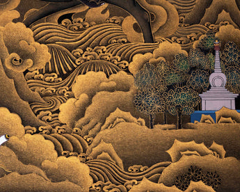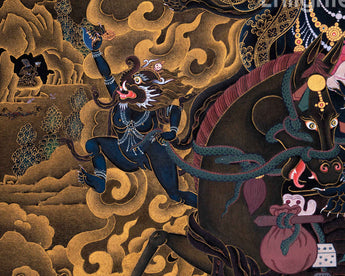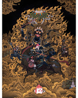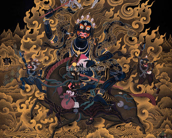 This captivating thangka features Palden Lhamo Kali, the fierce protector, and female deity often associated with the Hindu goddess. The painting showcases her striking posture, with a crown of skulls, a garland of severed heads, and her iconic riding on a mule. Her three eyes, sharp fangs, and outstretched tongue convey her terrifying power over evil forces. This hand-painted masterpiece is an aesthetically stunning piece and a sacred reminder of Palden Lhamo's protective energy. As a symbol of fearlessness, Palden Lhamo encourages the practitioner to overcome their fears and obstacles on their spiritual journey. Displaying this thangka in your home or meditation space will bring a powerful presence and connection to the energy of Palden Lhamo.