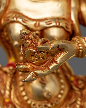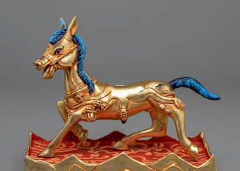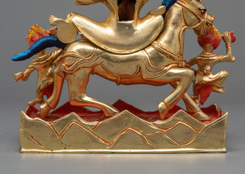 The 24k gold gilding and detailed acrylic paintings bring this copper statue to life, expressing every essence of Palden Lhamo's wrath and might. Her fierce look and commanding posture serve as a reminder of her unwavering dedication to preserving Buddhism's teachings and real practitioners.