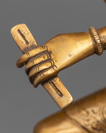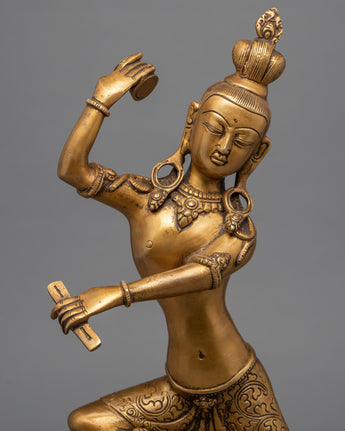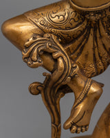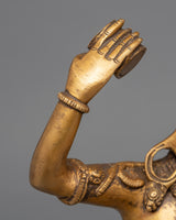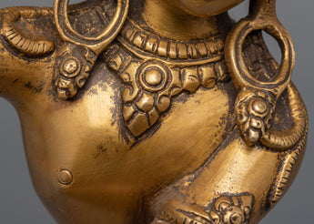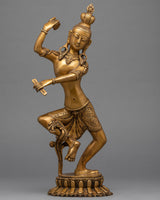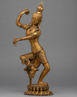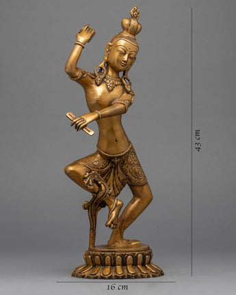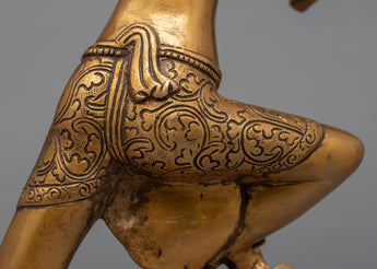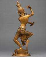 Parvati, the Hindu goddess of fertility, love, and devotion, is depicted in a graceful and elegant dancing pose in this brass statue. She is depicted standing on a lotus base, her body slightly bent and arms and legs in a graceful dance posture. The statue is intricately detailed, demonstrating the skill and expertise of the artisans who created it. The brass body adds a beautiful shines to the statue, highlighting Parvati's beauty and divinity. The statue is not only a beautiful work of art, but it also represents devotion and a spiritual connection to the Hindu faith. Collectors and devotees alike regard it as a valuable and cherished item.