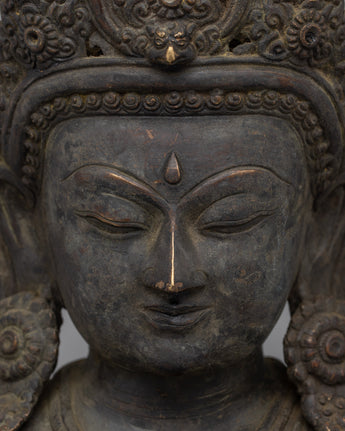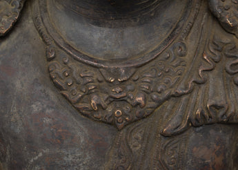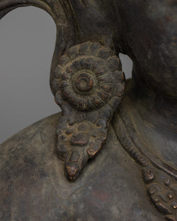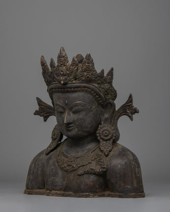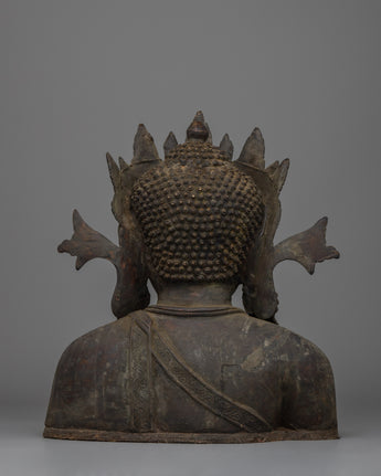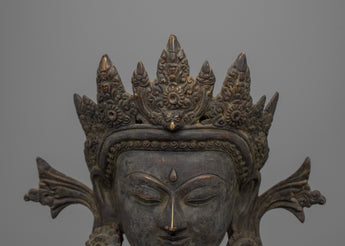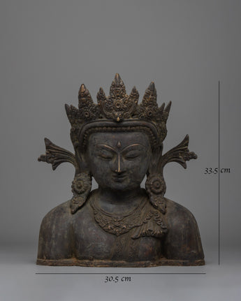 The overall antique finish of this brass figure highlights its provenance and historical appealing. The finish highlights the finer aspects of the craftsmanship, from the soft contours of the face to the complex textures of the garment draped over the shoulder. This tranquil Buddha head statue is more than simply a decorative piece; it is a strong spiritual symbol that may help create a calm and introspective environment in any space. Its heavy weight and large size make it an eye-catching addition to any spiritual or artistic collection.