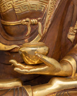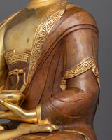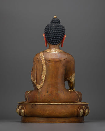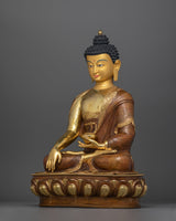 Shakyamuni Buddha is depicted sitting in the lotus pose (padmasana), indicating his steady concentration and mastery over the distractions of the material world. His right hand stretched toward the earth in bhumisparsha mudra, represents his moment of enlightenment, inviting the earth to witness his waking. The left hand, lying gently in his lap in dhyana mudra, depicts the profound state of meditation and mindfulness that leads to insight and clarity.