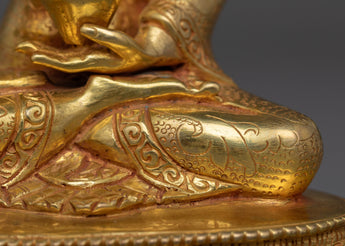 The Peaceful Figurine of Shakyamuni Buddha is a beautifully crafted piece with a height of 5.7 inches (14.5 cm) and a base width of 4.1 inches (10.5 cm). Made from a copper body, it is adorned with 24K gold gilding, complemented by gold and acrylic paintings that highlight its intricate details. This statue, created by skilled Nepalese artisans, radiates spiritual importance, making it an ideal for altars, meditation rooms, and religious home decor.