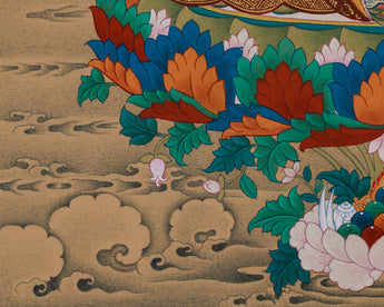 Guru Rinpoche, also known as Padmasambhava, is the revered founder of Tibetan Vajrayana Buddhism. Amitabha Buddha, the Buddha of Infinite Light and Compassion, is depicted above Guru Rinpoche to symbolize the inseparable union of wisdom and compassion. Together, they represent the ultimate goal of the spiritual path: awakening through enlightened guidance and boundless love. This thangka serves not only as a devotional piece but also as a meditation aid, illustrating the profound relationship between the master and the Buddha. Their combined depiction inspires practitioners to cultivate healing, protection, and enlightenment, making it a significant work of art in Tibetan Buddhist tradition.