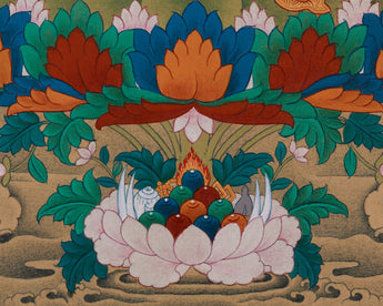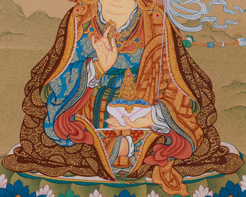 Our exceptional Guru Rinpoche with Amitabha Buddha thangka is meticulously hand-painted on premium cotton canvas using authentic natural Lhasa stone pigments and genuine 24K gold. The natural Lhasa stones are precious mineral pigments sourced from the Tibetan plateau, valued for their vivid, long-lasting colors and spiritual purity. Master artisans carefully grind and mix these pigments to create vibrant hues that bring the sacred imagery to life with unparalleled depth and luminosity. The 24K gold detailing is applied with precision to highlight divine features and sacred symbols, reflecting centuries-old Karma Gadri painting techniques renowned for their elegant compositions and delicate landscapes.