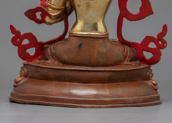 Our Peaceful Manjushri sculpture, which combines wisdom and tranquillity in one elegant form, reveals the essence of peace. The exquisite 24K gold gilding gleams with grace, displaying the careful artistry in each contour, and is rooted in an oxidized copper base. Manjushri's delicate dedication to dispelling the veils of ignorance is exemplified by the gold and acrylic embellishments, which serve as whispers of ancient tales. Beyond its captivating aspect, this sculpture fosters a deep sense of peace, prompting the observer to a balance of comprehension and calm thought.