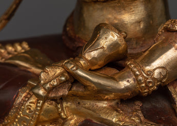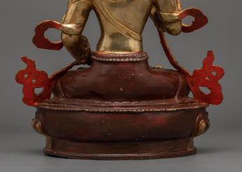 The statue, exquisitely gilded in 24k gold, displays an ethereal glimmer, luring the viewer into a realm of inner purification and spiritual grace. The oxidized copper body is covered with elaborate acrylic paintings, each detail mirroring Vajrasattva's teachings and symbolisms. Its substantial weight and stature guarantee that it stands as a symbol of purity in any spiritual environment or meditation alcove.