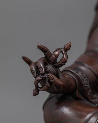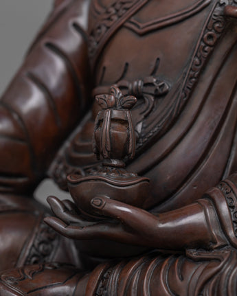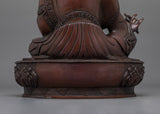 Pema Guru Rinpoche monument reflects the spirit of Guru Rinpoche's enlightened presence, with each detail carefully created to portray his calm and strong personality. The statue's 11.2-inch base assures stability while also adding to the piece's overall majesty. The oxidized finish gives the statue an aged appearance, representing Guru Rinpoche's timeless knowledge and teachings, inspiring practitioners worldwide.
