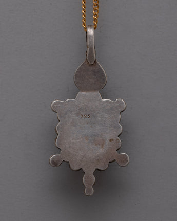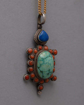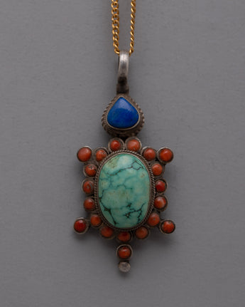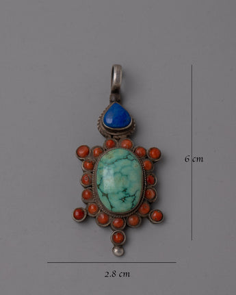 Discover the beauty of our finely crafted sterling silver pendant, which is made by hand. The centerpiece of this magnificent piece is made of genuine turquoise stones, which are prized for their vivid blue-green tones and unspoiled beauty. Carefully positioned Artificial coral and Lapis stones surround the turquoise, producing an eye-catching contrast and boosting the pendant's overall beauty.