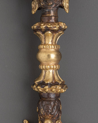 The Phurba Ceremonial Tool is a striking blend of artistry and spiritual significance, crafted from copper and elegantly gold-plated to symbolize both beauty and sacred power. Featuring a sharp, three-sided blade, it embodies the ability to cut through ignorance and dispel negative influences. Widely used in Tantric rituals, Buddhist offerings, and spiritual ceremonies, the Phurba channels potent energies that cleanse and protect your space from harmful vibrations. Its copper finish, combined with gold plating creates a magnificent appearance, making it not only a powerful spiritual instrument but also a captivating centerpiece for any Buddhist altar or ritual setting.