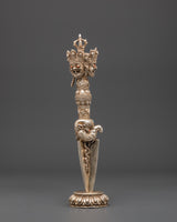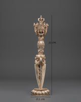 This phurba, made of copper with a silver-plated finish, stands 33cm tall, 8.5cm wide, and weighs 1.96kg, giving it a strong presence as both a ceremonial object and a work of art. The elaborate carvings feature protective deity faces and sacred symbols, while the three-edged blade represents the transformation of the three poisons: ignorance, attachment, and aversion. Each detail represents the skill of Himalayan craftspeople, resulting in a meaningful and authentic product.