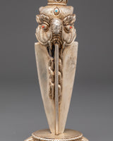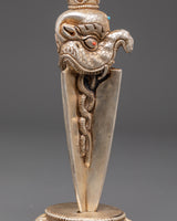 This silver-plated phurba is a revered Tibetan ritual dagger that has traditionally been used in Buddhist ceremonies to eliminate negativity and bad energy. The phurba, also known as the Vajra Kila, is a strong spiritual implement that anchors positive energy and symbolizes wisdom and compassion triumphing over ignorance and illusion. It is an essential object in Vajrayana activities, and it is frequently placed on altars or utilized in rituals to provide protection.