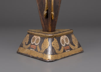 The Phurba Meditation Tool, with its three-edged blade, signifies the removal of ignorance, attachment, and aversion—the three poisons that hinder the road to enlightenment in Buddhist philosophy. The handle is frequently embellished with religious themes and deity faces, evoking the energy of Vajrakilaya, the vengeful protective deity connected with overcoming obstacles. The delicate ironwork is accented with glittering brass and silver inlays, heightening its holy beauty and ritualistic significance. When placed on a meditation altar or utilized in ceremonies, this instrument is thought to anchor spiritual energies, ward off bad spirits, and protect the environment from harmful effects.