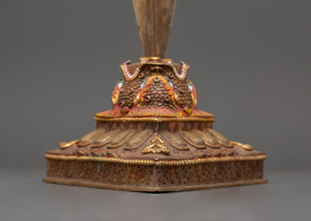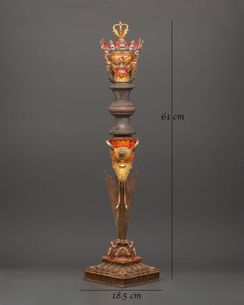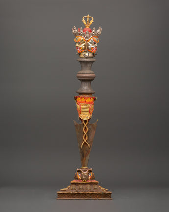This beautiful Phurba Sacred Ritual Item stands 61 cm tall and 18.5 cm wide. This remarkable ceremonial weapon weighs 4.74 kg and comprises copper, iron, gold plating, silver plating, and an acrylic color. The Phurba, a ritual blade, has long been utilized in Tibetan Buddhist ceremonies to represent the elimination of bad energies. Its strong three-blade shape symbolizes eradicating negative energy, making it an indispensable instrument for spiritual practitioners.