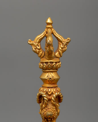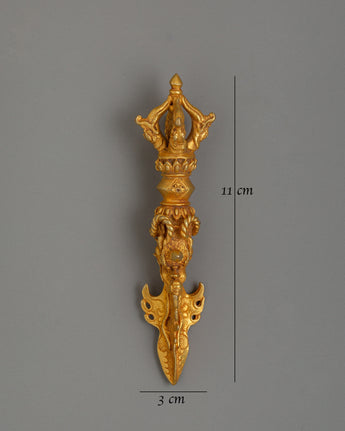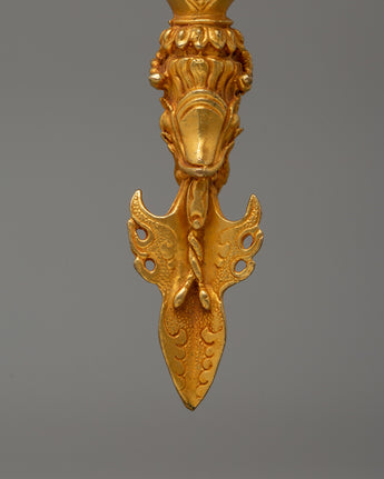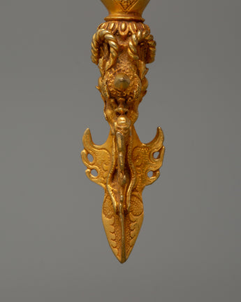 This handcrafted three-sided Phurba, made of gold-plated copper, is a revered Tibetan Buddhist ceremonial tool for energy cleaning, protection, and transformation. The Phurba dagger, also called a Kīla or ritual peg, is renowned in Vajrayana Buddhism for its capacity to cut through negative energies, dispel ignorance, and anchor spiritual strength. Monks and tantric practitioners use it in ceremonies to overcome impediments and purify areas.
