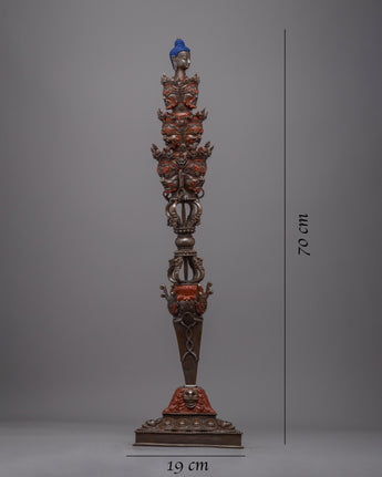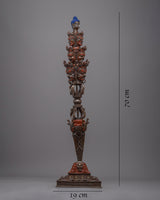 The Phurba Tibetan Dagger is an exquisite work of art, carefully created by hand with an oxidized copper body. Its impressive and intricate design, which measures 70 cm in length, perfectly captures Tibetan spirituality and culture. The dagger has engraved and embellished symbols that add to its aesthetic appeal and spiritual significance. It also includes a stand for convenient display, making it an eye-catching centerpiece in any room. The Phurba Tibetan Dagger is a representation of Tibetan artistic talent and cultural heritage, whether it is used for personal defense or decoration.