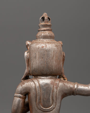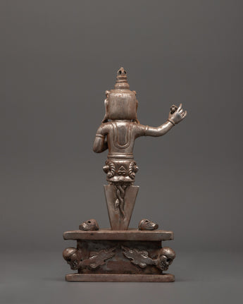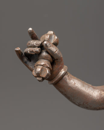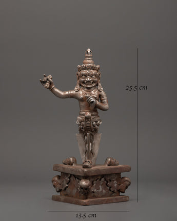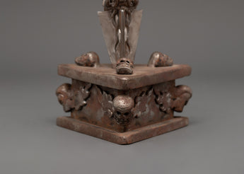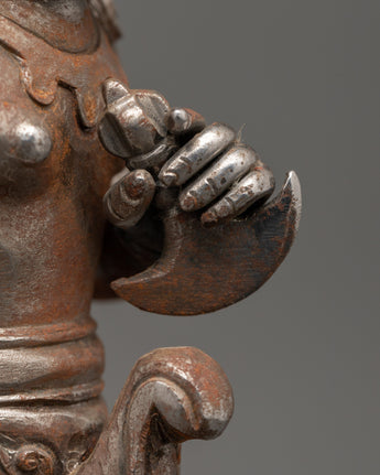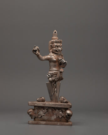 At the center of the design is a wrathful deity—a symbol of compassionate force—holding a Vajra, the unbreakable symbol of awakened wisdom. This potent artifact, combined with the Phurba's three-sided blade that slices through ignorance, attachment, and hatred, is used to subjugate negative energies, cleanse dense energy, and focus on ritual purposes. This Phurba is an excellent complement to any spiritual altar, whether used for shrine setting, meditation, or Vajrayana ceremonies.