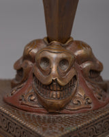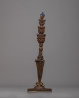 Dive deep into the world of Tibetan artistry with the Phurba with Display Stand. Skillfully handcrafted on an oxidized copper body, this Phurba towers at a remarkable 37cm. Boasting a unique design with multiple heads crafted atop, it's more than a ritualistic tool; it's a conversation piece. Accompanied by a stand, it's ready to grace your space with its majestic presence.