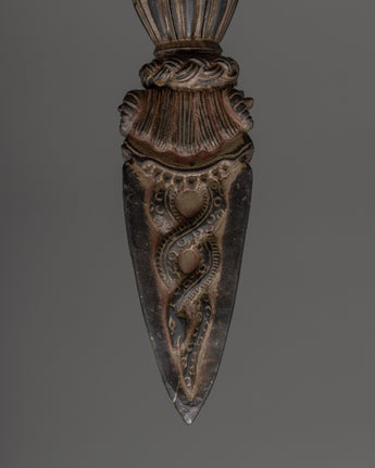 The Phurba, often called the "spiritual dagger," holds a story as old as Tibetan Buddhist traditions themselves. It is more than just an object; it is a symbol of transformation and protection. Legend tells that the Phurba was gifted by divine beings to cut through negativity and ego, dissolving barriers that keep us from enlightenment. Used in sacred rituals, its pointed blade represents the sharp wisdom needed to sever ignorance, while its three sides symbolize the unification of body, speech, and mind. Holding or gazing upon a Phurba is said to invoke courage and clarity, guiding one toward inner peace and spiritual awakening.