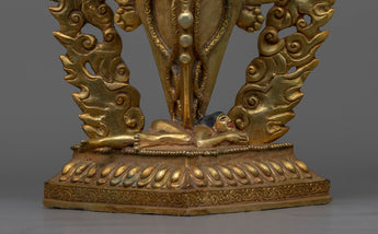 Develop the benefit of the transforming power of this 13.3" Dorje Phurba Vajrakilaya statue, which was carefully created by talented Nepalese craftspeople. This remarkable item contains an acrylic painting that highlights the deity's expressive face features on a copper body that is gilded in 24K gold. Outstanding quality and careful detail are ensured by the classic lost wax casting process. This Dorje Phurba Vajrakilaya statue, which is 34 cm in height and 21.5 cm at the base, is ideal for altarpieces, home décor, and special gifts that encourage spiritual development and understanding of other cultures.