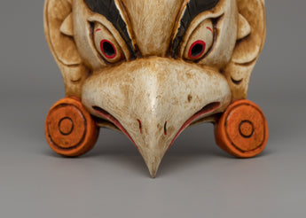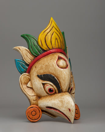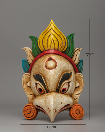 Crafted from wood, the mask's elaborate design depicts Garuda's strength and courage, making it an ideal addition to any home shrine or spiritual practice area. Beyond its beauty, it provides spiritual protection and transformation, resulting in a strong vibe in your environment. This mask is a work of art and a tool for attracting divine blessings and spiritual development.