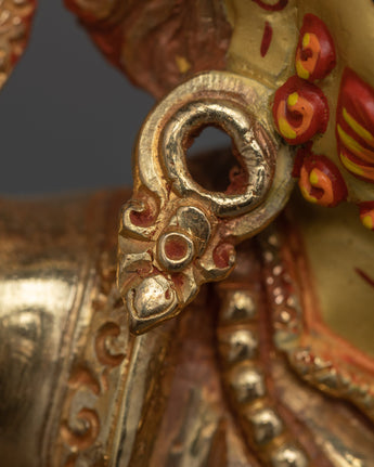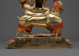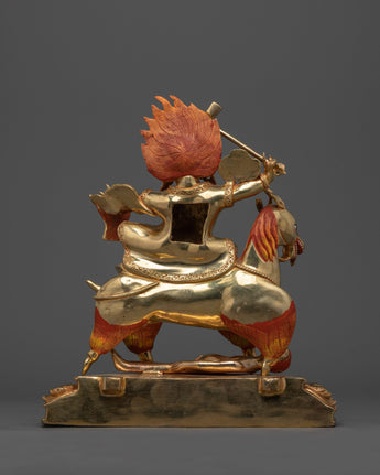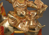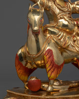 The statue of Garwa Nagpo Damchen, a strong powerful protector god, is 13.4 inches tall with a 9.8-inch base and weighs 4.57 kg. This statue, made of 24K gold-gilded copper and featuring gold and acrylic paints, depicts Damchen's powerful and menacing appearance. Damchen, known for his dark color and stern appearance, is depicted riding a horse as a metaphor of his ability to move and overcome obstacles. The horse balso reflects his tenacity in defending Buddhist teachings against obstacles and negative influences.