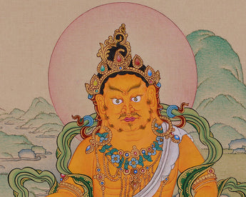 This Wealth Deity, Jambhala is a hand-painted thangka from our studio, created in the traditional Karma Gadri style using natural stone colors and 24K gold. These natural mineral colors give the artwork vibrant, lasting hues, while the 24K gold adds a radiant, sacred glow. Dzambhala is a revered figure in Tibetan Buddhism, the guardian of wealth and prosperity, whose blessings support material abundance and spiritual growth.