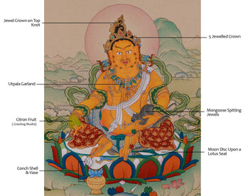 Jambhala’s iconography is rich with meaningful symbols that express his divine power and benevolence. He is seated on a lotus throne atop a moon disc, wearing a five-jeweled crown, a mongoose symbolizing wealth and generosity, and a citron fruit representing the granting of wishes and fulfillment of desires. Additional elements like a conch shell and sacred vase at his feet enhance the thangka's auspicious energy, making it a powerful spiritual talisman for prosperity and protection.