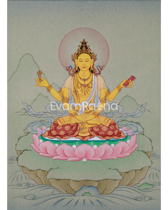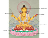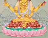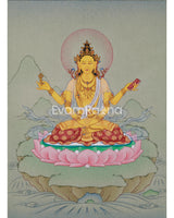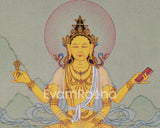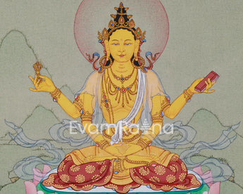 This stunning Prajna Paramita Thangka features the Wisdom Mother Prajna, meticulously handpainted using authentic stone colors on handmade cotton canvas. This Tibetan art piece embodies the essence of wisdom and enlightenment, making it an exceptional addition to any meditation or sacred space. Each thangka comes with a complimentary silk brocade, enhancing its elegance and value.