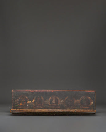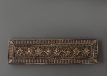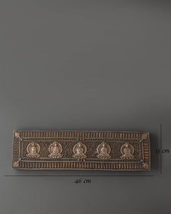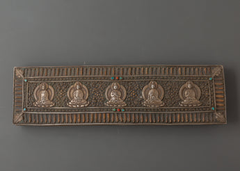 The intricate silverwork delicately frames each of the Five Dhyani Buddhas, showcasing exceptional craftsmanship and adding an air of refined elegance. Vibrant turquoise and coral inlays enhance the piece with traditional Himalayan colors, emphasizing its cultural and spiritual heritage. More than just a protective cover, this prayer book case is a sacred object crafted to uplift rituals, deepen meditative practice, and serve as a stunning display. It is a powerful focal point in monasteries, shrines, or private collections. Embrace this exquisite piece to honor Buddhist tradition while enhancing the spiritual atmosphere of your sacred space.