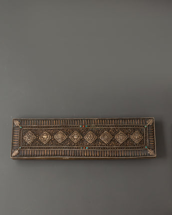 Combining copper, pure silver, turquoise, and coral, this prayer book cover captures the essence of Tibetan craftsmanship. Perfect for collectors of Buddhist relics, devoted spiritual practitioners, and those who appreciate Himalayan artistry, this piece delivers both cultural depth and exceptional beauty. Enhance your collection with the Prayer Book Cover featuring Five Dhyani Buddhas, beautifully inlaid with silver, copper, coral, and turquoise, an exquisite example of Tibetan Buddhist ritual art.