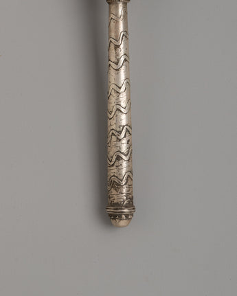 This meticulously crafted prayer wheel for dharma stands 23.5 cm tall, 5 cm wide, and weighs 0.148 kg. It is a blend of materials with deep meaning and craftsmanship. The focal point is the prayer wheel's cylinder, which contains two rows of Tibetan mantras. This elegantly designed wheel is fixed on a silver pole that doubles as a holder. The silver permits easy rotation of the upper section, which is crafted from sustainably sourced buffalo bone and has an organic, classic feel. According to Tibetan Buddhist customs, spinning the prayer wheel with the wrist is thought to bless the surroundings, instill peace, and disseminate positive energy.
