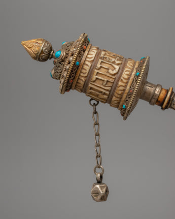 The upper half of the prayer wheel has more elaborate carving with the mantra, showing buffalo bone artistry. Delicate floral designs are meticulously carved, and silver inlays refine the prayer wheel, resulting in a balanced blend of earthiness and spirituality. Jewels, including turquoise, are placed around the prayer wheel, giving it color and enhancing its attractiveness. These stones are ornamental and symbolic of Tibetan culture and spirituality. The prayer wheel's overall design makes it a spiritual tool and a work of art.