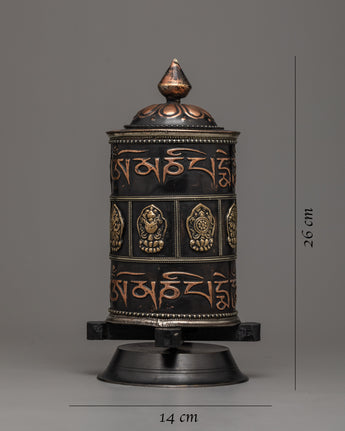 Introducing our Prayer Wheel Spinner, which is 26 cm tall and painstakingly crafted by hand from a combination of copper and brass. Every spinner is a living illustration of both spiritual devotion and traditional craftsmanship.