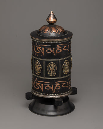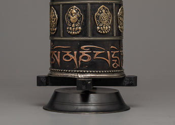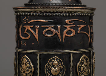 This prayer wheel, which was made with great care and reverence, is evidence of the artisan's talent and commitment. Its design is given a sense of timeless elegance and cultural richness by the combination of brass and copper, which results in an alluring symbol of spiritual practice.