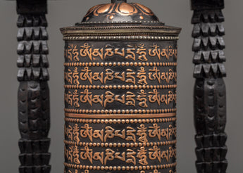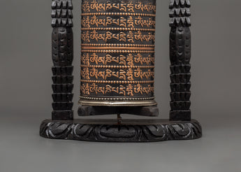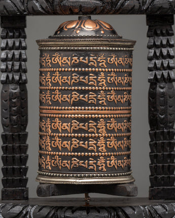 The wheel is securely fixed within a hand-carved wooden frame, representing stability and balance in spiritual practice. The metalwork is exquisitely detailed, featuring ancient themes and auspicious symbols, making this prayer wheel a powerful and artistically appealing piece. Its considerable size and sturdy construction provide stability and reverence, making it ideal for temple settings, home shrines, and meditation areas. The wheel is incorporated into everyday rituals as a meditation anchor, helping to focus the mind and generate positive karma. It serves as both a functioning ritual object and a symbol of the Dharma Wheel.