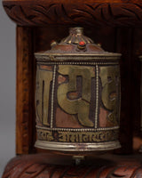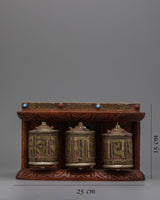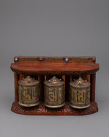 The Buddhist Prayer Wheels Tibet are a stunning handcrafted set that perfectly captures the dazzling brilliance of Tibetan handicraft along with its profound spiritual legacy. This one-of-a-kind piece has three prayer wheels set on a durable wood wall frame. Each prayer wheel is expertly crafted from brass and copper. As prayer wheels spin to spread blessings and good energy, they have great cultural and spiritual significance in Tibetan Buddhism, which is reflected in their exquisite design and amazing details. Artificial stones such as coral and turquoise are inlaid.