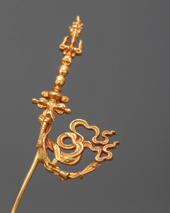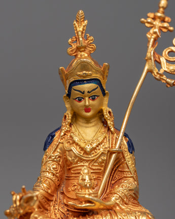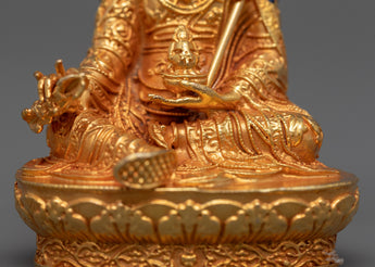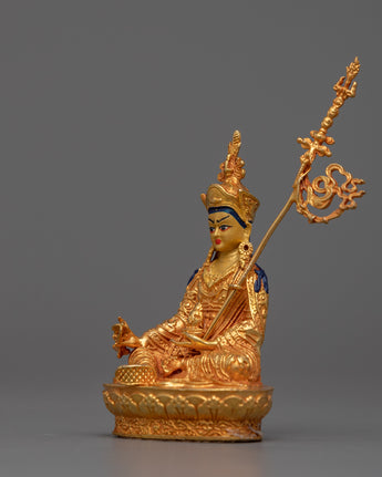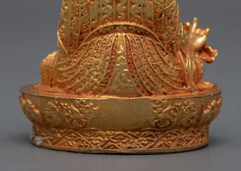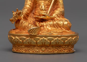 The "Prayers to Guru Rinpoche" statue represents tremendous reverence and devotion to the revered Tibetan guru. Crafted utilizing innovative machine processes, this statue has precise detailing on a copper body that is exquisitely decorated with sumptuous 24k gold plating. Standing at a modest 8.5cm height, it reflects Guru Rinpoche's spiritual essence and teachings, asking practitioners to pray and meditate.