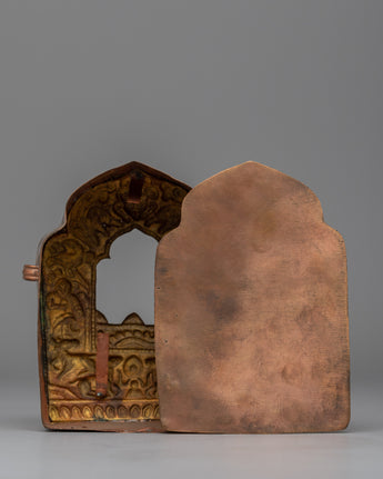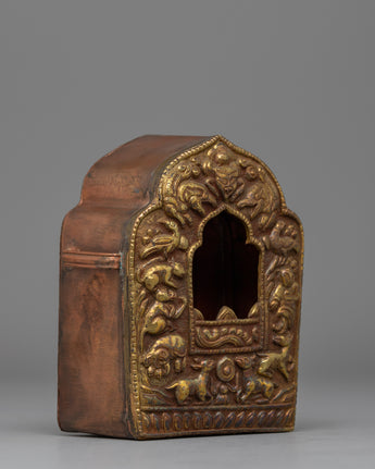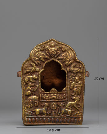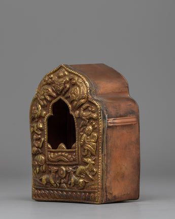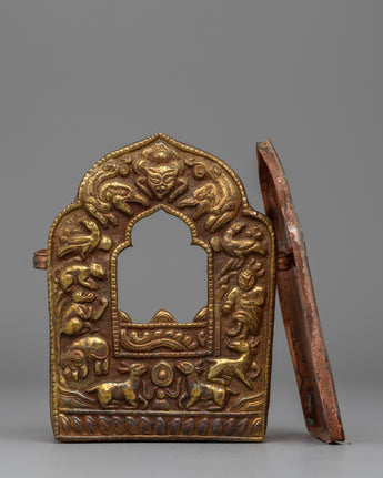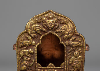 With elaborate motifs showcasing artisans' skill, this Ghau Box is carefully designed with a copper body and Plated with Electro-Gold. Its intricate engravings and lightweight design make it a multipurpose item that can be worn as an amulet to attract protection and good fortune throughout the day, used to contain holy relics, or assembled into a portable shrine.