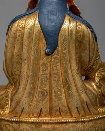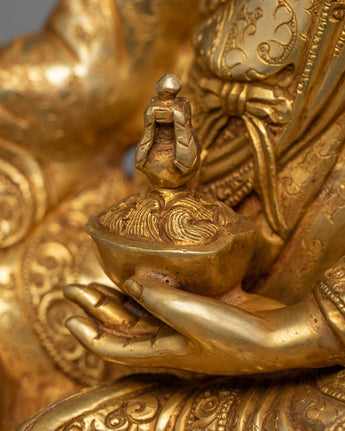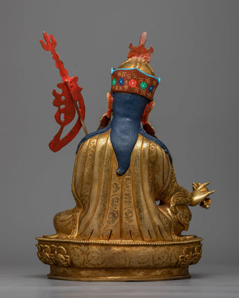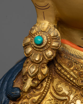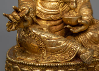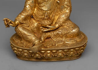 The statue is beautifully constructed with a copper body, which is known for its durability and spiritual resonance. It is gilded in sumptuous 24K gold, symbolizing the statue's sacred character and Padmasambhava's enlightenment. The intricate gold and acrylic paintings further enhance the statue, capturing Padmasambhava’s dignified expression and the symbolic attributes he holds, including the vajra and the skull cup. Padmasambhava is depicted in a meditative yet powerful posture, symbolizing his profound spiritual insight and mastery of tantric practices. He is revered for his teachings and for bringing Buddhism to Tibet, securing his place as a central figure in Tibetan spiritual history.
