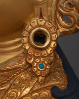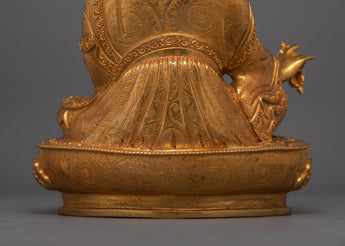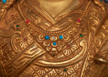 The Precious Guru Rinpoche Statue, at 13.8 inches tall, represents the respected guru of Tibetan Buddhism, famed for his limitless wisdom and spiritual strength. This magnificent statue, made of copper, is gilded with dazzling 24K gold and accented with beautiful gold and acrylic paintings that underline his tranquil yet commanding presence. The delicate intricacies of his robe, face, and ornaments are the work of excellent artisans, bringing this enlightened figure to life.