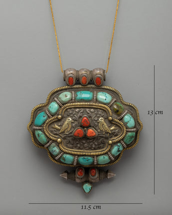 This Precious Mantra Holder Ghau Box is made of 94% silver and embellished with original coral and turquoise stones. It measures 13cm in height and 11.5cm in width and weighs 0.51 kilograms. Its powerful yet beautiful shape makes it both a sacred ritual object and a treasured piece of jewelry. Historically, the Ghau Box was treasured for its spiritual importance, representing longevity, success, and positive energy. It is intended to carry mantras and sacred artifacts, and it functions as a potent amulet to fend off evil spirits and attract good luck. Whether exhibited on a Buddhist shrine or worn as a necklace, it strengthens one's connection to their spiritual path and improves meditation techniques.