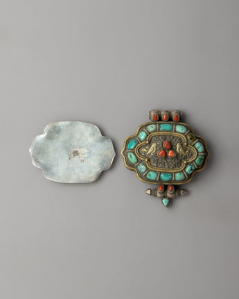 The ornate design of this Ghau Prayer Box is rich with symbolism. The silver body is expertly created with elaborate patterns that symbolize protection and spiritual harmony. Coral and turquoise stones are treasured in Buddhism as symbols of courage, healing, and the connection between the spiritual and physical realms. The primary engraved image of two birds symbolizes peace and unity, while the vivid gemstones heighten the piece's spiritual aura. This prayer box is not only a useful meditation tool but also a beautiful ornament that symbolizes the eternal desire for enlightenment. Its unusual design distinguishes it as a spiritual artifact and cherished remembrance.