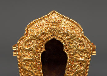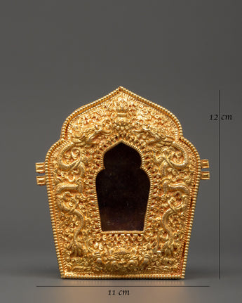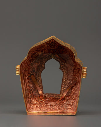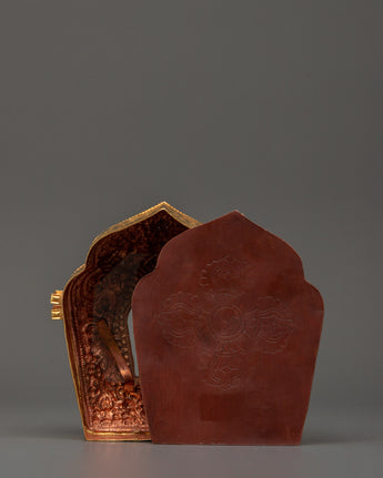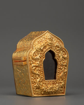 The Precious Relic Holder Ghau Box measures 12 cm in height and 11 cm in breadth, weighing a delicate 0.21 kilograms. This magnificent box is made of copper and beautifully gold-plated, providing an ideal blend of durability and elegance. Its small size makes it suitable for storing and protecting valuable relics, making it an excellent addition to any altar, shrine, or meditation place. The gold-plated copper body represents the box's ageless beauty and sacredness, highlighting its significance in Buddhist meditation and devotion.