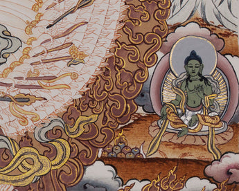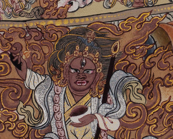 Our thangka is a hand painting of “Protector Dukkar- Goddess of the White Umbrella”. It is a beautifully hand-made art where natural stone colors and 24K gold is used. Right at the center of the art lies Protector Dukkar, at her sacred feet lies The Three Brother Lord- The Mahakalas and surrounded by other Bodhisattvas.